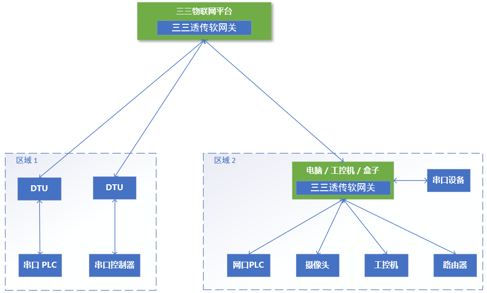 在圖中,區(qū)域 1 的設(shè)備通過(guò) DTU 將串口信號(hào)轉(zhuǎn)為 TCP 流,實(shí)現(xiàn)了和平臺(tái)上的透?jìng)鬈浘W(wǎng)關(guān)通信。在區(qū)域 2 中的局域網(wǎng)中,部署了一個(gè)透?jìng)鬈浘W(wǎng)關(guān),其具備的串口、網(wǎng)口通信能力讓它可以和局域網(wǎng)中的所有設(shè)備通信。另外,我們需要在三三平臺(tái)上配置了一些透?jìng)饕?guī)則。這樣組網(wǎng)后,區(qū)域 1 和 區(qū)域 2 的所有設(shè)備相互之間,都可以實(shí)現(xiàn)互相通信。