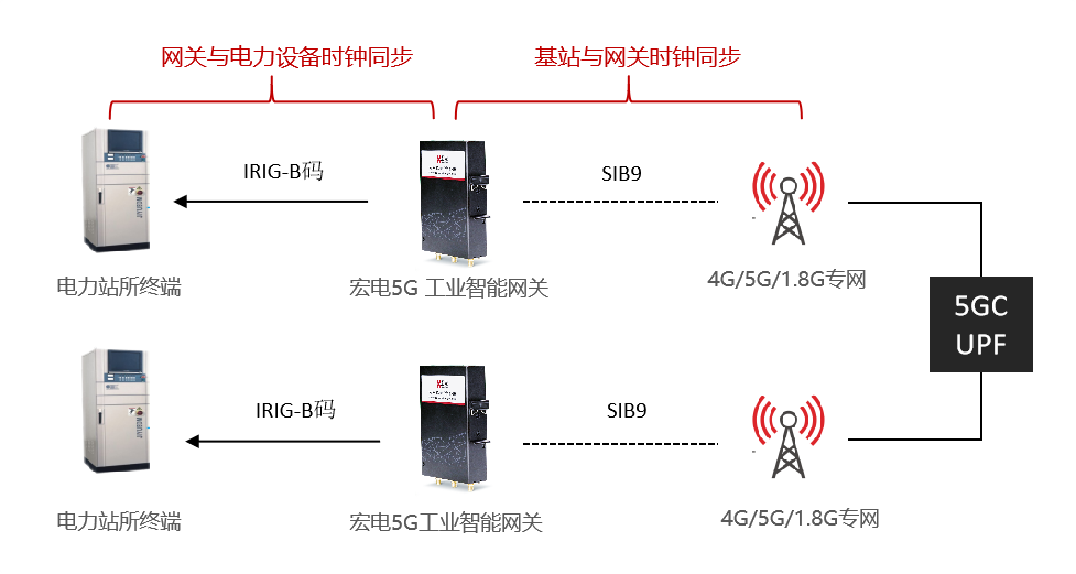智能配網(wǎng)站所終端DTU裝置通過網(wǎng)口接入宏電5G工業(yè)網(wǎng)關(guān),網(wǎng)關(guān)通過SIB9消息獲取當(dāng)前時(shí)鐘信息,再以IRIG-B碼的方式脈沖到電力終端,兩臺(tái)網(wǎng)關(guān)輸出時(shí)間差僅為10us左右,通過網(wǎng)關(guān)高精度授時(shí)的點(diǎn)到點(diǎn)雙向通信網(wǎng)絡(luò)來保證數(shù)據(jù)高速傳輸,幫助差動(dòng)保護(hù)裝置快速定位隔離故障,完成故障自愈,實(shí)現(xiàn)配網(wǎng)差動(dòng)保護(hù)業(yè)務(wù)。