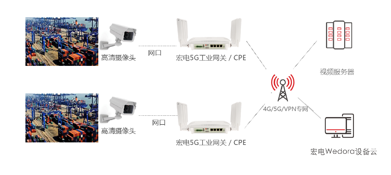在港口集裝箱碼頭部署宏電5G工業(yè)CPE搭建遠(yuǎn)程監(jiān)控系統(tǒng),通過遠(yuǎn)程高清視頻方式實(shí)時(shí)查看龍門吊現(xiàn)場工作情況,減少人員定期攀爬龍門吊查詢視頻帶來的安全風(fēng)險(xiǎn),同時(shí)利用5G網(wǎng)絡(luò)的高速特性,后端安全管控人員可以實(shí)時(shí)調(diào)用前端畫面,當(dāng)發(fā)現(xiàn)有異常情況時(shí)立即呼叫,將安全隱患遏制在萌芽階段。