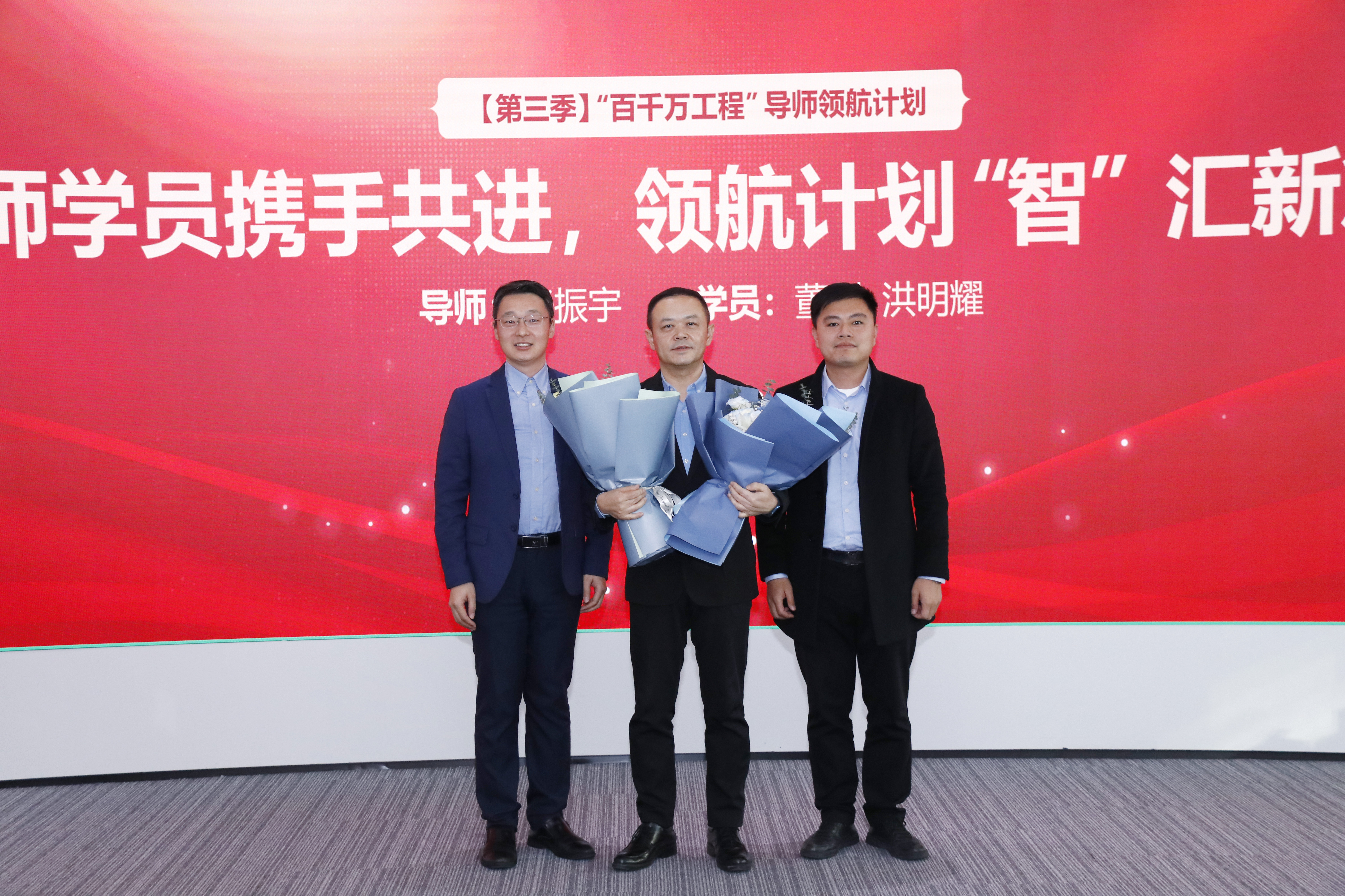 導師張振宇(中)與學員董剛(左)、洪明耀(右)合影