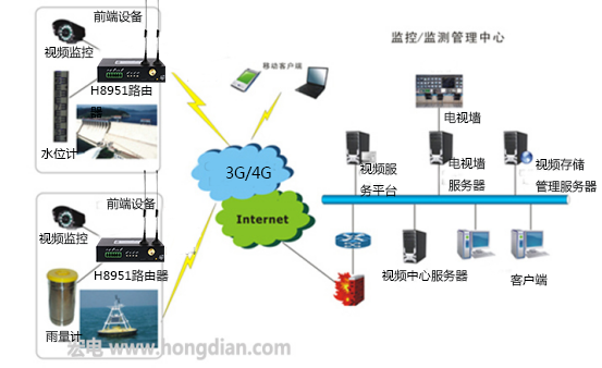 前端設(shè)備包括無線路由器H8951,攝像頭,水位傳感器和遙測(cè)終端機(jī)。 水位信息和視頻圖像以無線網(wǎng)絡(luò)發(fā)送;服務(wù)器提供數(shù)據(jù)中轉(zhuǎn),用戶權(quán)限管理等;客戶端提供用戶查看水位信息和實(shí)時(shí)視頻,并將這些信息通過H8951無線通信設(shè)備傳遞給后方,動(dòng)態(tài)數(shù)據(jù)在后臺(tái)數(shù)據(jù)庫(kù)整理后在指揮中心電視拼接墻顯示出來,供決策人員進(jìn)行現(xiàn)場(chǎng)指揮和統(tǒng)籌兼顧。