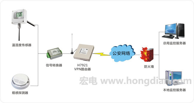 本系統由本地監(jiān)控中心計算機、機房溫濕度傳感器、煙感裝置、信號轉換器、網絡和監(jiān)控計算機組成。遠程監(jiān)控終端裝置將無人值守機房的溫濕度和煙感信號加以采集、通過深圳宏電3G/4G無線路由器把數據傳回監(jiān)控計算機;監(jiān)控計算機收到數據后用專業(yè)的數據軟件加以分析、整理,顯示在屏幕上供監(jiān)控人員參考,并采取相應措施。