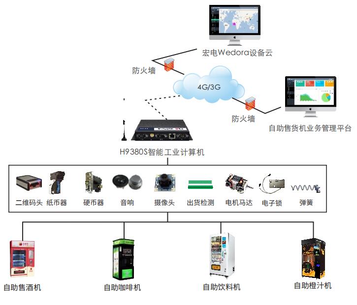 宏電智能工業(yè)計算機為售貨機提供穩(wěn)定無線聯(lián)網(wǎng)通道,4G無線網(wǎng)絡(luò)代替有線網(wǎng)絡(luò),只需要在原有售貨機后增加一臺宏電智能工業(yè)計算機產(chǎn)品,即可完成系統(tǒng)部署,售貨機在任何地方都能夠聯(lián)網(wǎng),實現(xiàn)售貨機貨物庫存數(shù)量、支付信息等數(shù)據(jù)實時安全傳輸,售貨機開關(guān),調(diào)整商品價格等遠程控制操作。