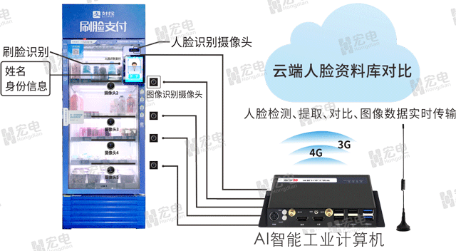 方案通過宏電H9380P AI智能工業(yè)計算機(jī)接入刷臉識別攝像頭,實現(xiàn)人臉圖像信息的實時采集處理、高清圖像數(shù)據(jù)提取上傳到云端人臉資料庫對比,實時反饋人臉數(shù)據(jù)處理信息,并控制AI售貨機(jī)門鎖開關(guān)、結(jié)算扣款