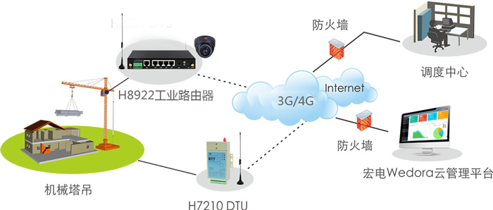 宏電塔吊機械安全管理系統(tǒng),主要由塔吊機械控制系統(tǒng),高清攝像頭,宏電H8922S工業(yè)路由器以及視頻監(jiān)控平臺
