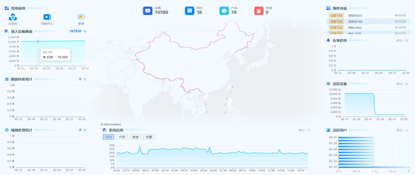 一張圖全局展示,包括全廠接入設備總數(shù)、數(shù)據(jù)轉發(fā)統(tǒng)計、告警事件及告警趨勢,支持增刪改查所有監(jiān)測、監(jiān)控、治理等前端硬件設備臺賬信息。