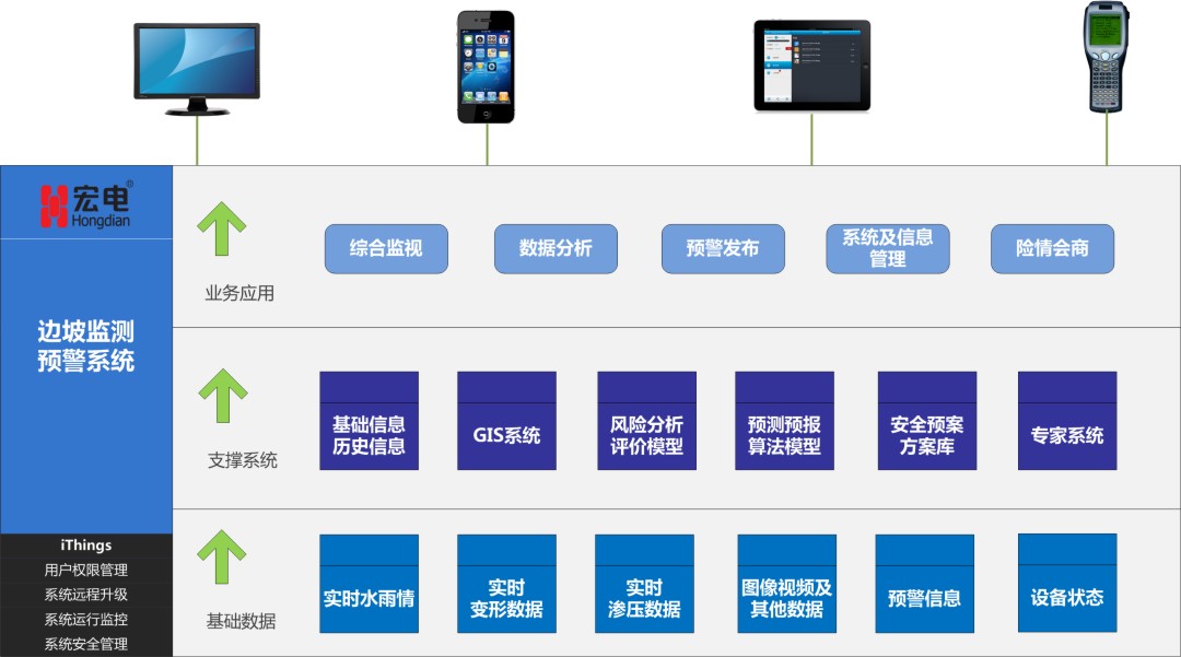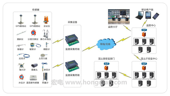宏電邊滑坡安全監(jiān)測(cè)預(yù)警系統(tǒng)由數(shù)據(jù)采集監(jiān)測(cè)子系統(tǒng)、專(zhuān)家分析及預(yù)測(cè)預(yù)報(bào)子系統(tǒng)、風(fēng)險(xiǎn)分析評(píng)價(jià)子系統(tǒng)、專(zhuān)家在線診治系統(tǒng)及預(yù)警預(yù)報(bào)模塊等組成,可實(shí)現(xiàn)全天候不間斷的實(shí)時(shí)在線監(jiān)測(cè)。