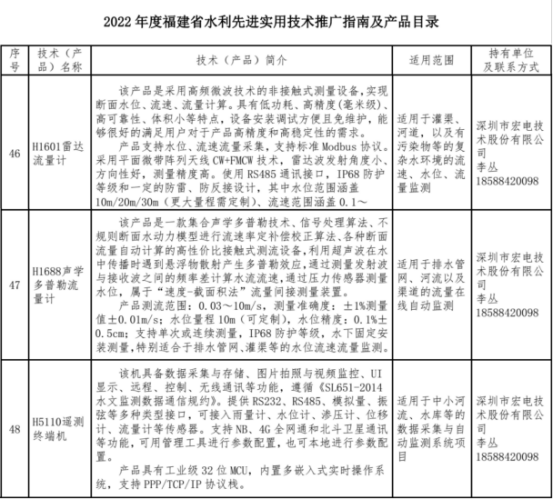 日前,水利部科技推廣中心福建省推廣工作站公布了《2022年度福建省水利先進(jìn)實(shí)用技術(shù)推廣指南及產(chǎn)品目錄》,包括中國(guó)水利水電科學(xué)研究院、長(zhǎng)江水利委員會(huì)長(zhǎng)江科學(xué)院等單位在內(nèi)的52項(xiàng)先進(jìn)實(shí)用技術(shù)入選,宏電股份自主研發(fā)的智能感知監(jiān)測(cè)產(chǎn)品H1601雷達(dá)流量計(jì)、H1688聲學(xué)多普勒流量計(jì)和H5110遙測(cè)終端機(jī)憑借“科學(xué)的技術(shù)原理、先進(jìn)有效的技術(shù)性能指標(biāo)、合理的成本價(jià)格和良好的應(yīng)用效益”等優(yōu)勢(shì)位列其中。