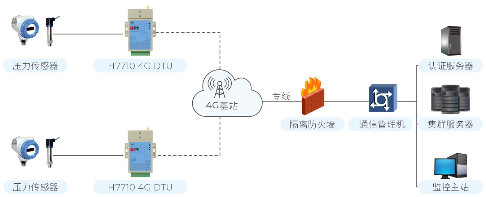 宏電H7710工業(yè)級4G DTU將供水管網(wǎng)的壓力數(shù)據(jù)實(shí)時(shí)上傳到監(jiān)控平臺,實(shí)時(shí)可視化監(jiān)測供水管網(wǎng)壓力變化情況,及時(shí)發(fā)現(xiàn)管網(wǎng)異常壓力變化,為管網(wǎng)安全運(yùn)行提供保障。