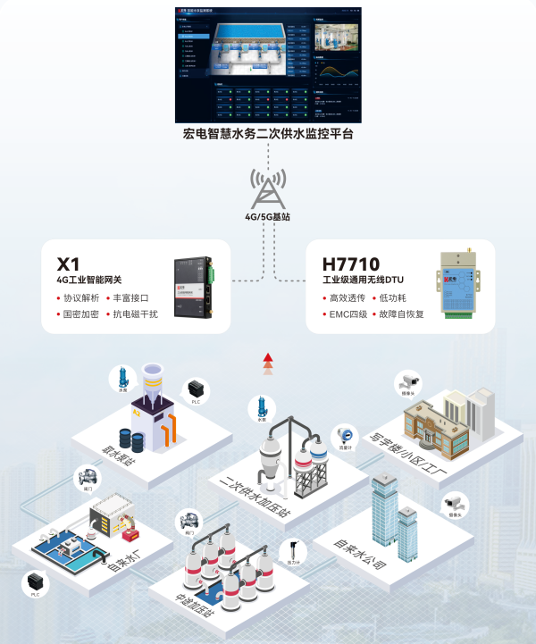 系統(tǒng)涵蓋城市供水中的水源地取水、水廠制水、管網(wǎng)輸水、加壓送水、用戶用水等各個(gè)環(huán)節(jié),以宏電工業(yè)無(wú)線通信終端為核心,實(shí)現(xiàn)全流程供水管網(wǎng)的遠(yuǎn)程監(jiān)管和智能聯(lián)動(dòng)控制,優(yōu)化生產(chǎn)調(diào)度,保障高效供水,促進(jìn)節(jié)能降耗,降低產(chǎn)銷差,是水司實(shí)現(xiàn)智慧化運(yùn)營(yíng)的重要途徑。