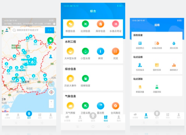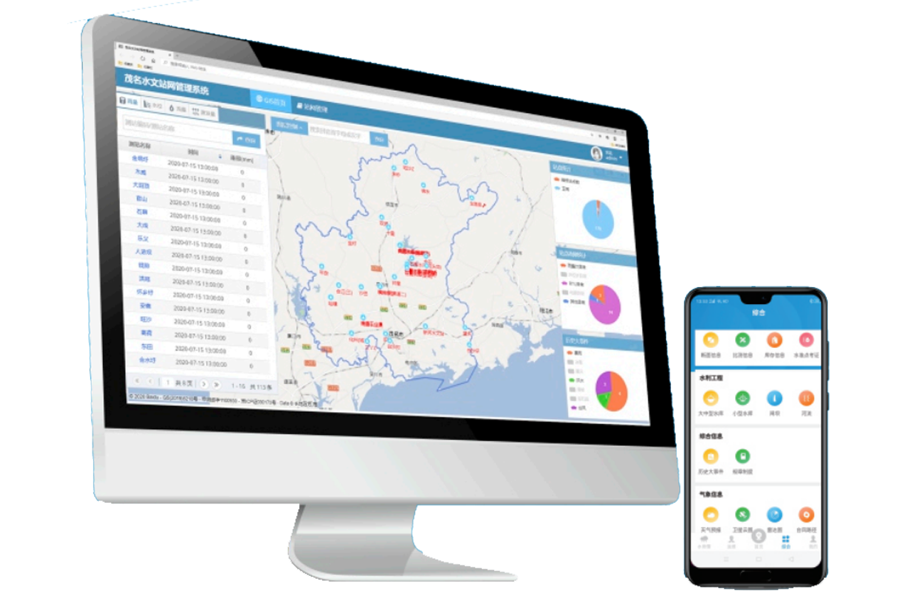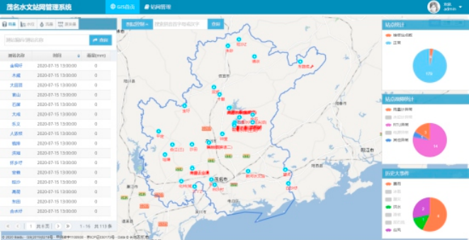 地圖展示實(shí)時(shí)(最新)雨量、水位、流量、泥沙和蒸發(fā)量信息,以突出方式顯示設(shè)備故障信息和圖標(biāo),提供在地圖上顯示站點(diǎn)的
