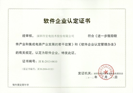深圳市宏電技術(shù)股份有限公司順利通過了審查獲得工信部軟件企業(yè)重新認(rèn)定,獲得新版軟件企業(yè)認(rèn)定證書。