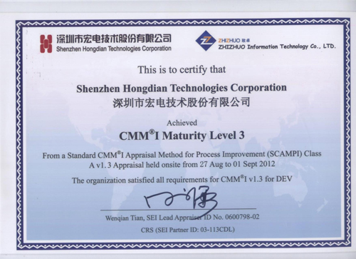 2012年9月1日,經過評審小組嚴格的審核和評估,SEI授權評估師隆重的宣布,深圳市宏電技術股份有限公司通過CMMI-ML3復審和重新認證。