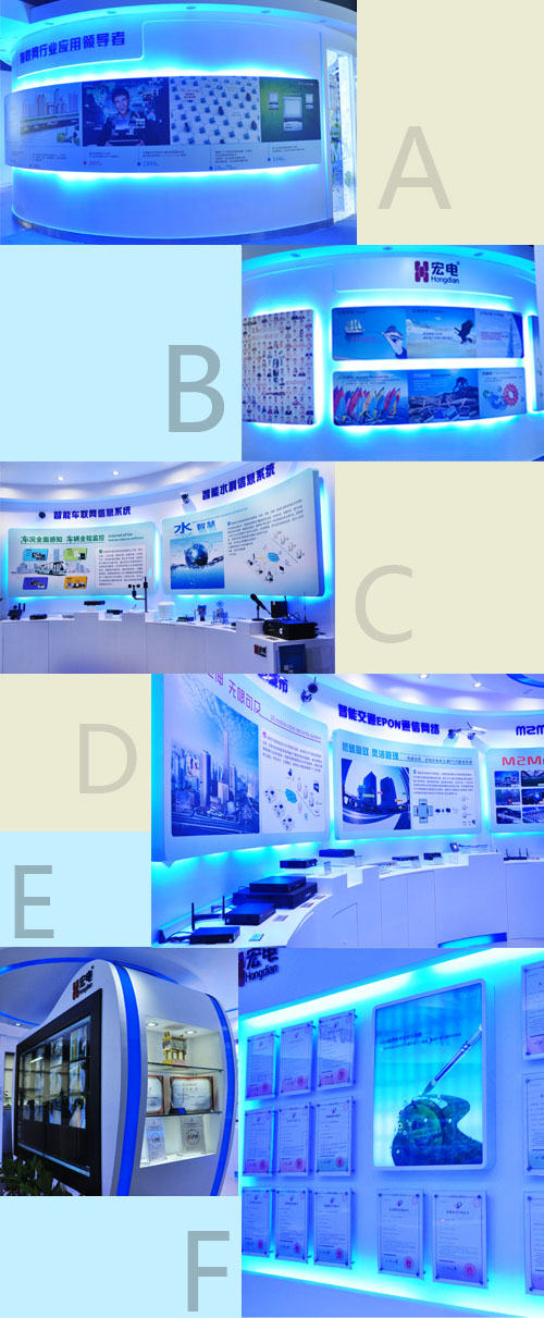 面向公司正門的外弧墻體(A區(qū))迎面展現(xiàn)著一副述說以M2M與物聯(lián)網(wǎng)掀起第三次信息技術(shù)革命的發(fā)展故事,一張張精心設(shè)計(jì)的圖片能夠讓參觀者在最短時(shí)間了解我國物聯(lián)網(wǎng)發(fā)展之路,迅速解答物聯(lián)網(wǎng)是什么,未來物聯(lián)網(wǎng)能夠做什么,M2M與物聯(lián)網(wǎng)的關(guān)系等多個(gè)疑問。與之對(duì)稱的另一面外弧墻體(B區(qū))以多塊展板圖片相互映襯,展示著宏電“創(chuàng)造智慧生活”遠(yuǎn)大愿景和企業(yè)經(jīng)營理念。展廳內(nèi)部空間更是做了精細(xì)的布置,相對(duì)著的兩面內(nèi)弧墻體(C區(qū)和D區(qū))劃分為5個(gè)小版塊,分別展示宏電在智能車聯(lián)網(wǎng)信息系統(tǒng)、智能水利信息系統(tǒng)、無線視頻及平安城市、智能交通EPON通信網(wǎng)絡(luò)、M2M及物聯(lián)網(wǎng)應(yīng)用五大重點(diǎn)行業(yè)的覆蓋傳感層、傳輸層、應(yīng)用層的成套硬件產(chǎn)品、軟件平臺(tái)和整體解決方案。在這里,展示著以無線傳輸和行業(yè)應(yīng)用為核心優(yōu)勢的40余款產(chǎn)品,包括3G車載硬盤錄像機(jī)、無線廣播預(yù)警終端、電力級(jí)DTU、金融版3G路由器以及智能交通EPON產(chǎn)品設(shè)備等多款拳頭級(jí)產(chǎn)品。同時(shí)水雨情信息平臺(tái)系統(tǒng)、山洪災(zāi)害廣播預(yù)警系統(tǒng)、3G車載視頻監(jiān)控系統(tǒng)、車載信息管理系統(tǒng)、M2M終端設(shè)備管理系統(tǒng)等多款平臺(tái)軟件,更是彰顯了宏電十余年嵌入式系統(tǒng)和應(yīng)用軟件開發(fā)的強(qiáng)勁科研實(shí)力。
