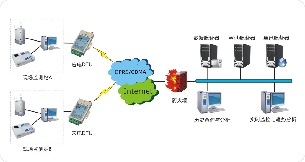 針對環(huán)保局面臨的監(jiān)測現(xiàn)狀,宏電股份聯(lián)合國內(nèi)某知名智慧環(huán)境監(jiān)測運營商為多省市環(huán)保局定制了智能環(huán)保監(jiān)測方案,基于宏電工業(yè)級無線通信終端DTU提供組網(wǎng)方案。通過宏電DTU設(shè)備把安裝在轄區(qū)各排污企業(yè)點的監(jiān)測儀器設(shè)備組成監(jiān)測系統(tǒng),用以采集點位的污染及質(zhì)量狀況數(shù)據(jù),并把采集的數(shù)據(jù)實時傳輸?shù)江h(huán)保局監(jiān)控中心,為執(zhí)法人員決策提供支撐。