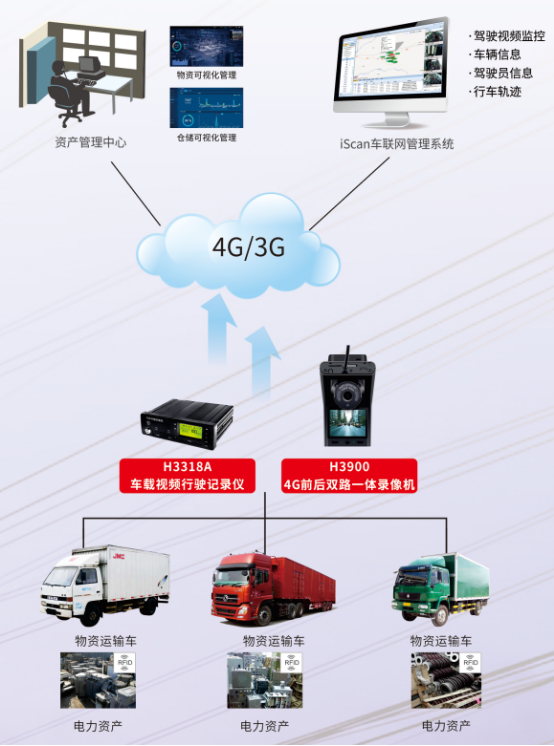 方案主要由RFID 射頻識別系統(tǒng)、車載傳感系統(tǒng),4G 視頻數(shù)據(jù)傳輸系統(tǒng)、宏電電網(wǎng)物資管理平臺、宏電iScan車聯(lián)網(wǎng)管理系統(tǒng)組成,4G 視頻數(shù)據(jù)傳輸系統(tǒng)部分通過在每輛物資運(yùn)輸車上安裝宏電H3318A車載形式記錄儀和H9300 4G前后雙路一體錄像機(jī),可以實(shí)時(shí)傳輸和監(jiān)測車輛的運(yùn)行狀況、駕駛員的情況,在出現(xiàn)異常的時(shí)候及時(shí)發(fā)出告警,通知司機(jī)和平臺人員,司機(jī)和平臺人員可以采取相應(yīng)的措施進(jìn)行補(bǔ)救,iScan車聯(lián)網(wǎng)管理系統(tǒng)借助于 3G/4G 高速無線網(wǎng)絡(luò)將運(yùn)輸車輛的實(shí)時(shí)運(yùn)行狀態(tài)和參數(shù)實(shí)時(shí)傳給后臺應(yīng)用服務(wù)器管理平臺,為運(yùn)營管理者提供實(shí)時(shí)管理與參考。