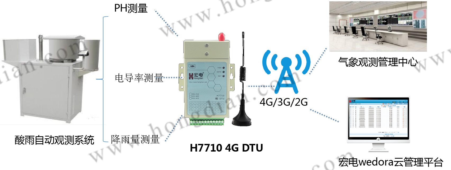該方案主要由宏電H7710 4G DTU、酸雨自動(dòng)觀測(cè)系統(tǒng)、氣象監(jiān)測(cè)中心組成,H7710 DTU RS-232接口接入酸雨自動(dòng)觀測(cè)系統(tǒng),通過DTU 4G高速無線網(wǎng)絡(luò)把酸雨自動(dòng)觀測(cè)系統(tǒng)采集到的降水PH值、電導(dǎo)率、降水樣溫度、降水量數(shù)據(jù)數(shù)據(jù)上傳到氣象觀測(cè)中心,氣象觀測(cè)人員通過采集到的觀測(cè)數(shù)據(jù)和信息,進(jìn)行質(zhì)量檢驗(yàn)和整合,形成完整的酸雨觀測(cè)數(shù)據(jù)記錄。