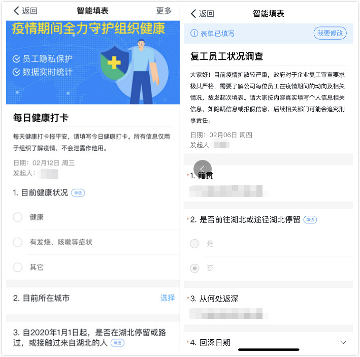 ▲員工每日健康打卡登記&復(fù)工員工狀況調(diào)查
