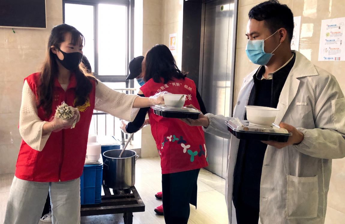 餐飲安全大于天。為加強(qiáng)員工用餐防疫管理,公司統(tǒng)一為員工預(yù)定中午工作餐,確保食品安全工作到位。中午黨支部志愿者們?yōu)閱T工派發(fā)工作餐,指引員工分批、間隔1米進(jìn)行取餐。