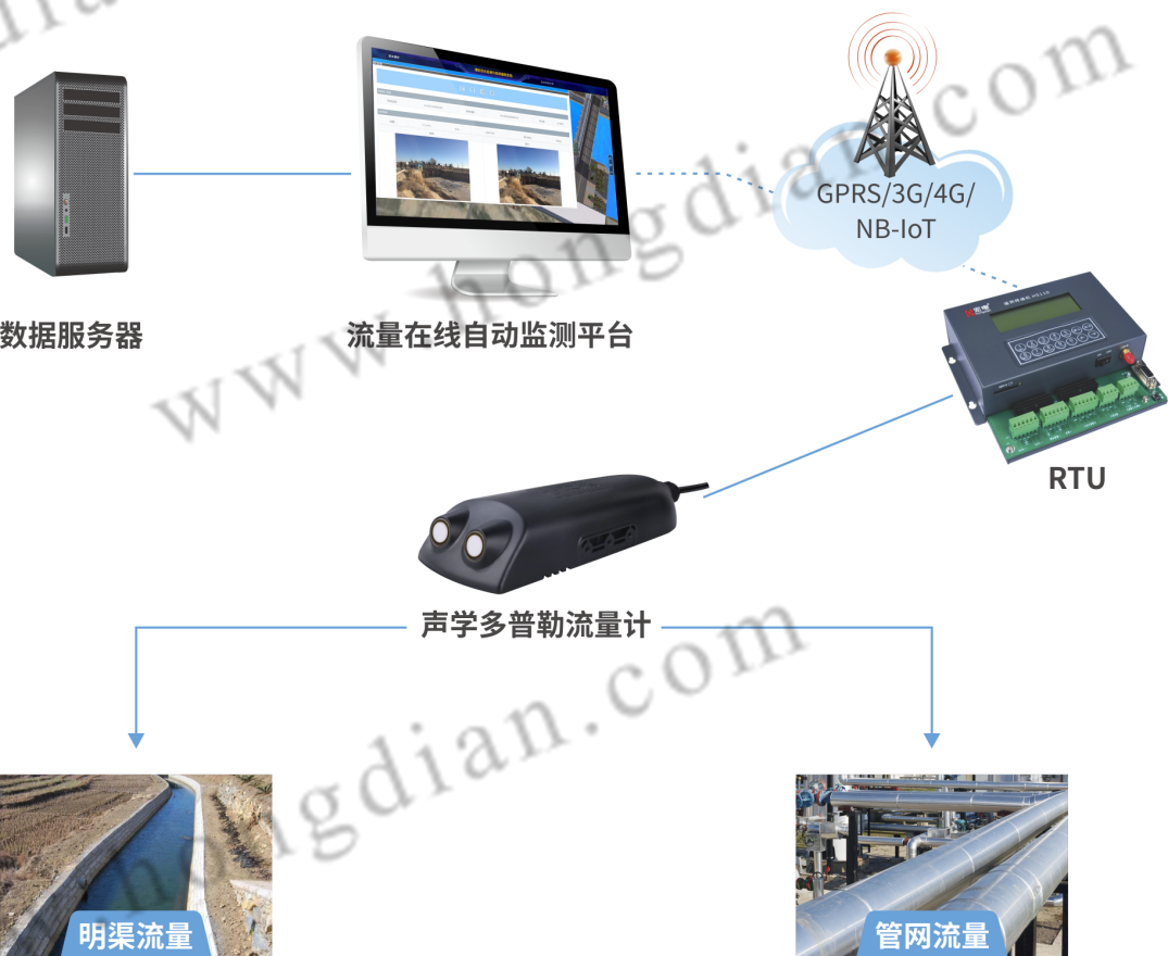 系統(tǒng)主要由現(xiàn)場(chǎng)采集單元、數(shù)據(jù)處理單元(測(cè)量主機(jī))、通信網(wǎng)絡(luò)和監(jiān)控中心數(shù)據(jù)服務(wù)平臺(tái)組成。系統(tǒng)由聲學(xué)多普勒流量計(jì)測(cè)量流體流速、水位、水溫和流量,遙測(cè)終端RTU將數(shù)據(jù)通過(guò)3G/4G/GPRS/SMS網(wǎng)絡(luò)傳輸至流量監(jiān)測(cè)中心,監(jiān)測(cè)中心結(jié)合相應(yīng)的監(jiān)控及分析軟件可實(shí)時(shí)對(duì)現(xiàn)場(chǎng)數(shù)據(jù)可視化監(jiān)測(cè),實(shí)現(xiàn)系統(tǒng)運(yùn)行無(wú)人值守、有人管理的模式。
