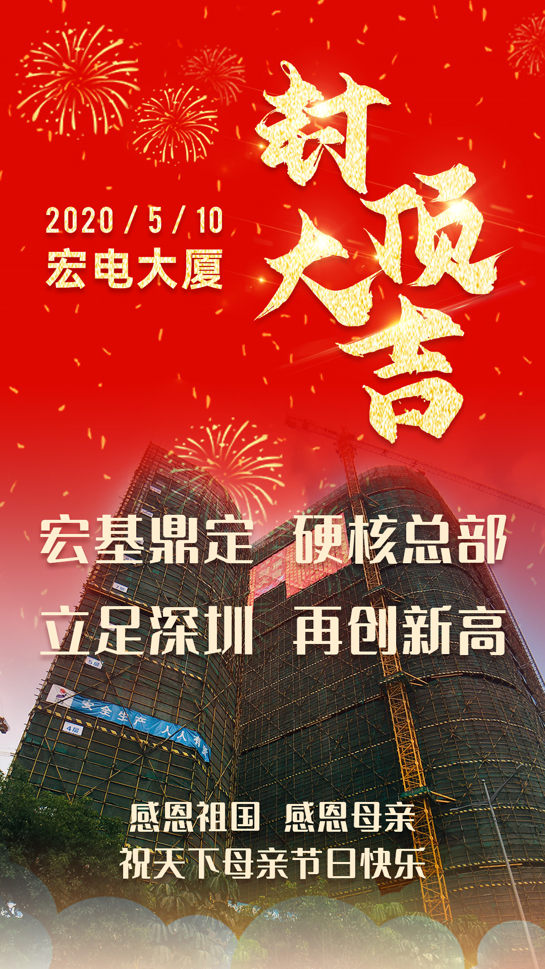 2017年12月26日毛主席誕辰紀(jì)念日,宏電大廈奠基;2020年5月10日母親節(jié),宏電大廈主體結(jié)構(gòu)封頂。在這個感恩的日子里,宏電感謝祖國母親,感謝深圳培育宏電的成長,感謝龍崗區(qū)給予宏電發(fā)展的空間。宏電大廈主體結(jié)構(gòu)順利封頂,標(biāo)志著宏電大廈建設(shè)進(jìn)入了一個新階段。未來,宏電將繼續(xù)堅定不移地走科技創(chuàng)新發(fā)展路線,在開拓自身業(yè)務(wù)的同時,助力深圳的發(fā)展,為祖國的經(jīng)濟(jì)繁榮做出貢獻(xiàn)。