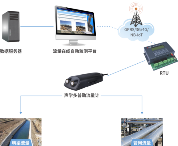 系統(tǒng)主要由現(xiàn)場采集單元、數(shù)據(jù)處理單元(測量主機(jī))、通信網(wǎng)絡(luò)和監(jiān)控中心數(shù)據(jù)服務(wù)平臺組成。系統(tǒng)由聲學(xué)多普勒流量計(jì)測量流體流速、水位、水溫和流量,遙測終端機(jī)RTU將數(shù)據(jù)通過3G/4G/GPRS/SMS網(wǎng)絡(luò)傳輸至流量監(jiān)測中心,監(jiān)測中心結(jié)合相應(yīng)的監(jiān)控及分析軟件可實(shí)時(shí)對現(xiàn)場數(shù)據(jù)可視化監(jiān)測,實(shí)現(xiàn)系統(tǒng)運(yùn)行無人值守、有人管理的模式。