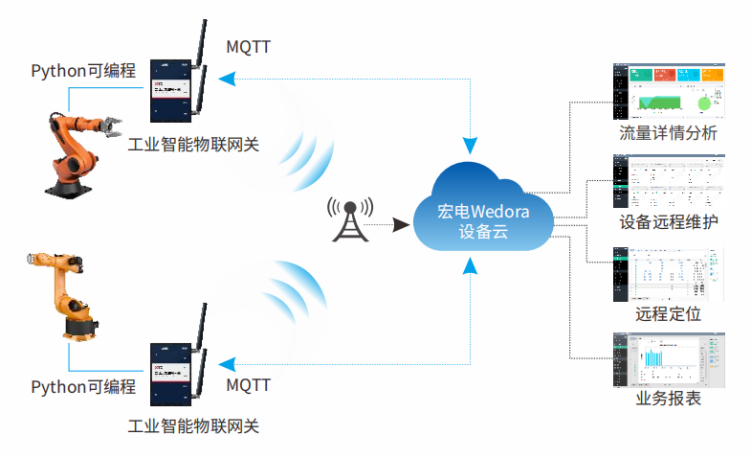 這對(duì)于并沒(méi)有如此多維護(hù)人員的機(jī)器人制造商來(lái)說(shuō)非常困難。同時(shí),由于設(shè)備是租賃的,也需要對(duì)機(jī)器人的位置進(jìn)行實(shí)時(shí)的監(jiān)控管理。針對(duì)客戶的痛點(diǎn),我們提供了一套遠(yuǎn)程智能裝備運(yùn)維解決方案,首先是通過(guò)配套宏電網(wǎng)關(guān)完成對(duì)機(jī)器人私有協(xié)議的對(duì)接并上傳到客戶的云端平臺(tái),實(shí)時(shí)了解機(jī)器人的工作狀態(tài);同時(shí),通過(guò)宏電的工業(yè)互聯(lián)網(wǎng)平臺(tái),通過(guò)sdlan,虛擬串口,VPN等技術(shù),能夠?qū)崿F(xiàn)對(duì)機(jī)器人的遠(yuǎn)程控制。最后,通過(guò)宏電網(wǎng)關(guān)收集到的基站小區(qū)信息,實(shí)現(xiàn)室內(nèi)基站定位,完成了資產(chǎn)管理功能。