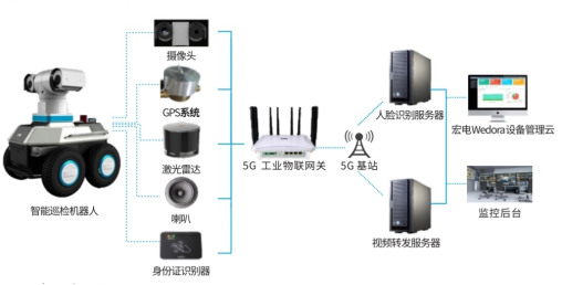 通過將宏電5G工業(yè)網關等設備內置于巡檢機器人或無人機設備內,實現巡檢機器人或無人機等移動化、智能化安防設備的 5G網絡接入,替代巡檢人員進行巡邏值守,采集現場視頻、語音、 圖片等各項數據,自動完成檢測、巡航以及記錄數據、遠程告警確認等工作;相關數據通過 5G網絡實時回傳至智能巡檢系統(tǒng),智能巡檢系統(tǒng)利用圖像識別、深度學習等智能技術和算法處理,綜合判斷得出巡檢結果,有效提升安全等級、巡檢效率及安防效果。