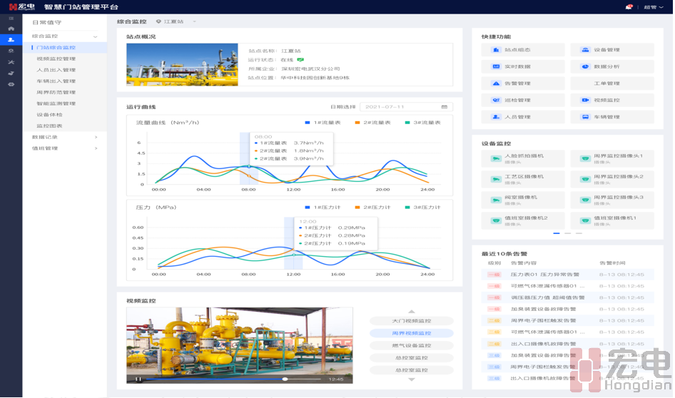 通過宏電4G/5G DTU將智能流量計、在線色譜儀、溫壓采集器等監(jiān)控數(shù)據(jù)實時回傳,對站點概況、流量、壓力曲線進(jìn)行綜合監(jiān)控,綜合展示場站運(yùn)行情況,場站健康狀態(tài),多維數(shù)據(jù)的集中展示。