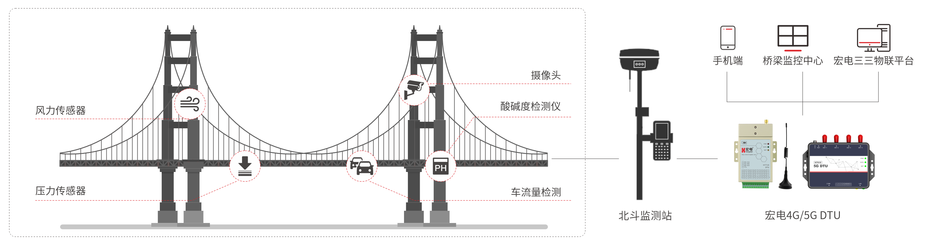 實(shí)現(xiàn)橋梁監(jiān)測(cè)數(shù)據(jù)全天候不間斷的采集,所有數(shù)據(jù)將通過宏電4G/5G DTU實(shí)時(shí)回傳至監(jiān)控中心,使監(jiān)測(cè)具有實(shí)時(shí)、直接、不間斷、高帶寬等特點(diǎn)。